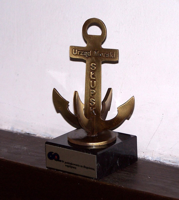 Statuetka firmowa dla Urzędu Morskiego w Słupsku, metalowa i galwanizowana, na czarnym granotowym postumencie