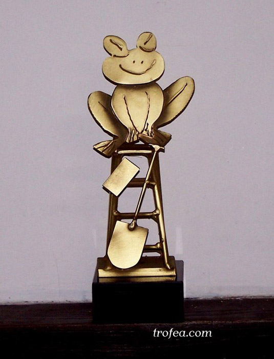 Statuetka firmowa dla Leroy-Merlin, wykonana ze stali i galwanizowana na złoty kolor, na czarnym granitowym postumencie