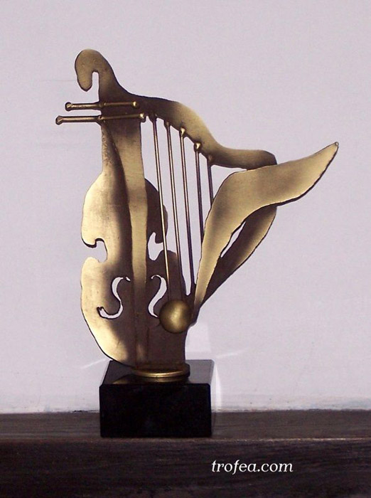 Statuetka muzyczna wykonana jako nagroda na konkurs muzyczny, metalowa na granitowym czarnym postumencie.