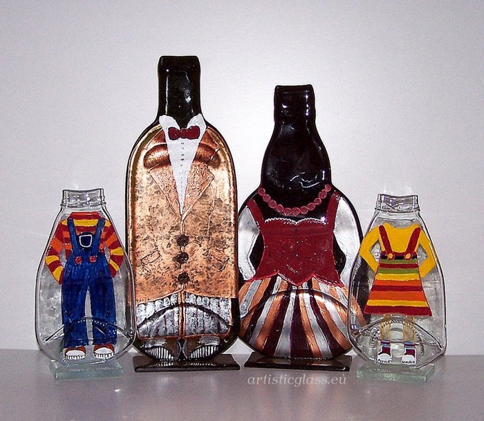 Rodzina butelkowskich. Statuetki zrobione ze stapianych butelek. Statuetki zdobione recznie.