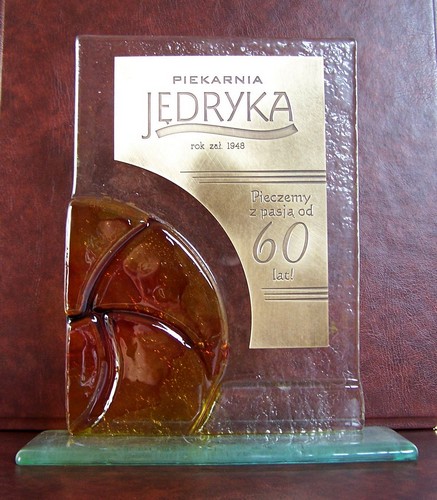Statuetka - 60 lat Piekarni Jędryka. Statuetka wykonana metodą fusingu z elementami metalowymi z grawerką.