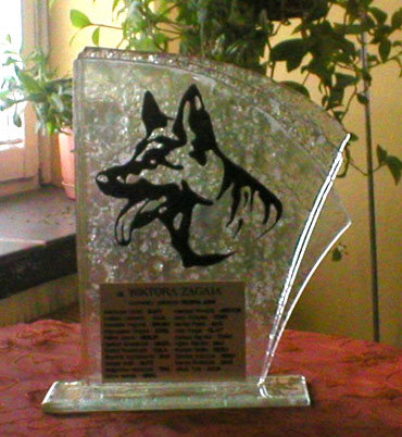 Owczarek Niemiecki - tatuetka szkalna. Wstępnie stopiona statuetka, z wykonaną recznie na statuetce grafiką. Na statuetce umiesczona tabliczka okolicznościowa.