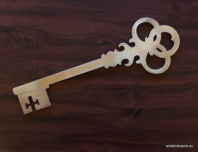 Statuetka - Klucz, stauetka stalowa pokryta niklem. Wymiary statuetki - dł. 35 cm, gr. 10 mm. Statuetka zaomocowana do podkładu w kolorze machoniu.