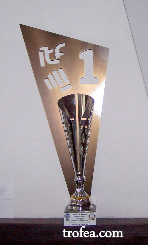 Statuetka sportowa Teakwondo ME wykonana ze stali, galwanizowana na kolor złoty, na czarnym granitowym postumencie z tabliczką.