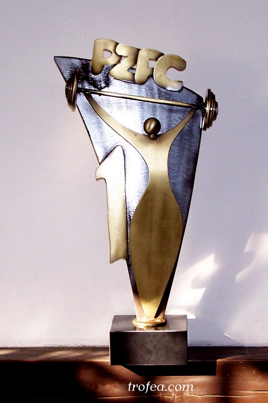 Statuetka sportowa w podnoszeniu ciężarów wykonana ze stali, galwanizowana na kolor złoty, na czarnym granitowym postumencie.