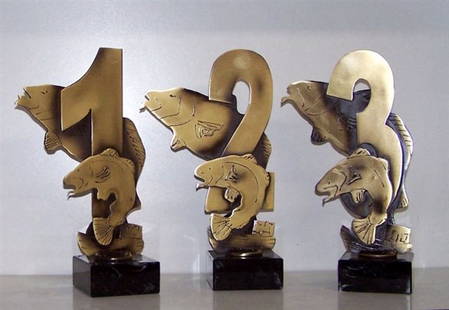 Statuetka sportowa wędkarska Dorsz wykonana ze stali i galwanizowana na złoto, w postaci dwóch ryb, miejsce 1, 2, 3 na zawodach sportowych.