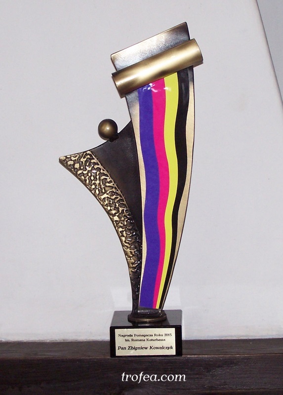Statuetka Nagroda Pomagacz Roku wykonana ze stali, galwanizowana na kolor złoty, dodatkowo różnokolorowe pasy, na czarnym marmurowym postumencie ze złotą tabliczką.