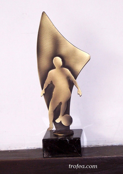 Statuetka sportowa (piłka nożna) metalowa, galwanizowana na kolor złoty, na czarnym granitowym postumencie.