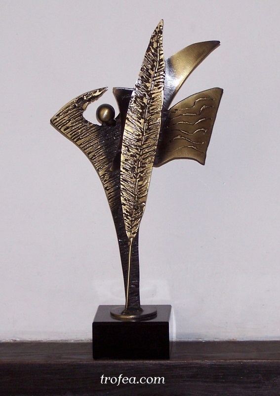 Statuetka Nauczyciel Roku 2016 wykonana ze stali, galwanizowana na kolor złoty, na marmurowym czarnym postumencie z tabliczką.