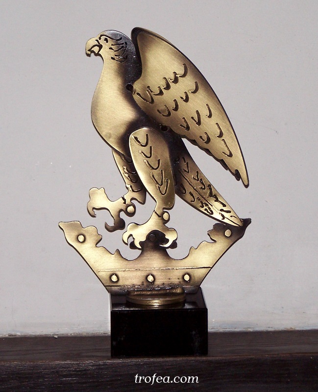Statuetka Gmina Sokoły wykonana ze stali, galwanizowana na kolor złoty, na marmurowym postumencie z tabliczką.