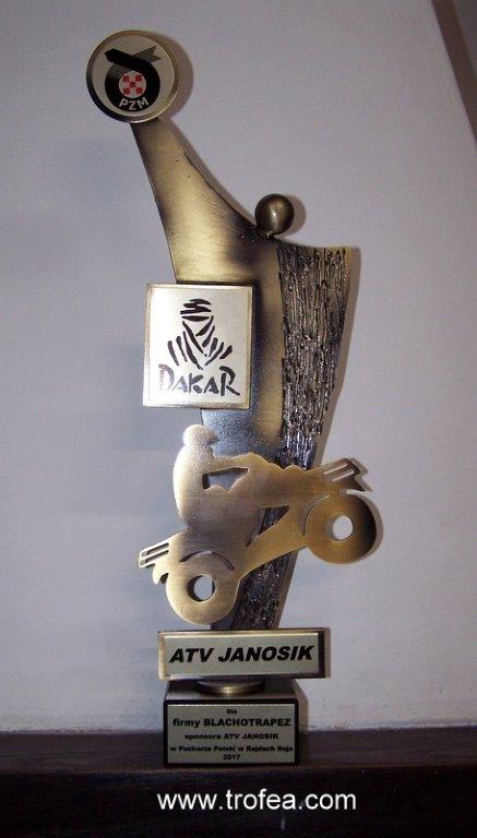 Statuetka sportowa PZM ATV Janosik wykonana ze stali, galwanizowana na kolor złoty, z grawerowaną tabliczką.