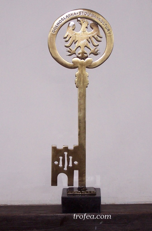 Statuetka Klucz Dolnośląska Nagroda Kultury wykonana ze stali, galwanizowana na kolor złoty, z grawerowaną tabliczką na granitowym postumencie.
