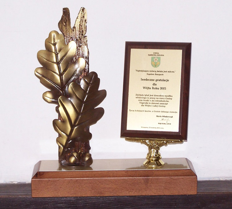 Statuetka Dla Wójta Roku 2015 wykonana ze stali, galwanizowana na kolor złoty, na drewnianym postumencie z tabliczką drewnianą.
