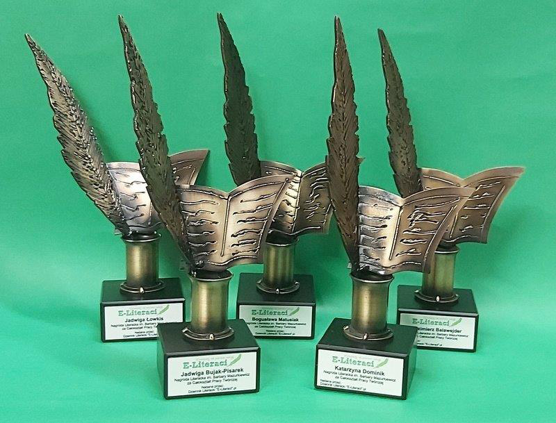 E-literaci.pl nagroda - statuetka wykonana ze stali z nadrukiem, z grawerowaną tabliczką.