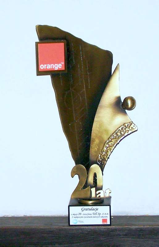 Statuetka firmowa Orange wykonana ze stali, galwanizowana na kolor złoty, na marmurowych postumencie z tabliczką.