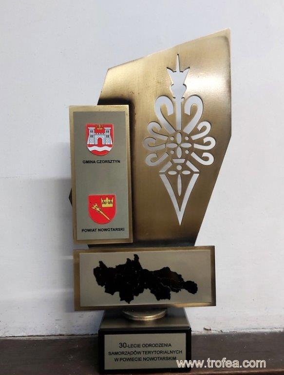 Statuetka samorządowa Gminy Czorsztyn Powiatu Nowotarskiego wykonana ze stali, galwanizowana na kolor złoty, z grawerowaną tabliczką.