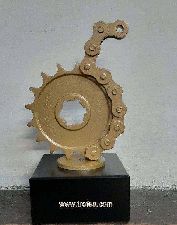 Statuetka sportowa Nagroda mtoryzacyjna wykonana ze stali, galwanizowana na kolor złoty, z grawerowaną tabliczką.