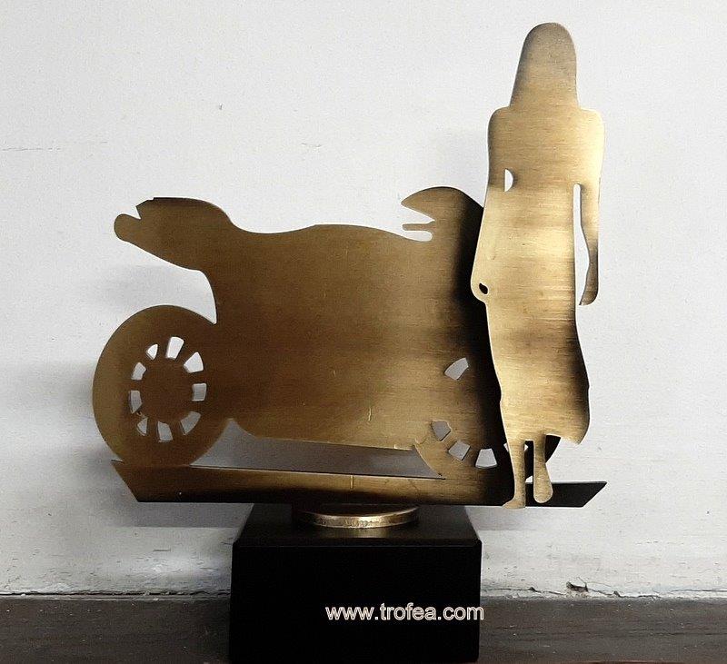 Statuetka sportowa Dama motocykl I wykonana ze stali, galwanizowana na kolor złoty, z grawerowaną tabliczką.