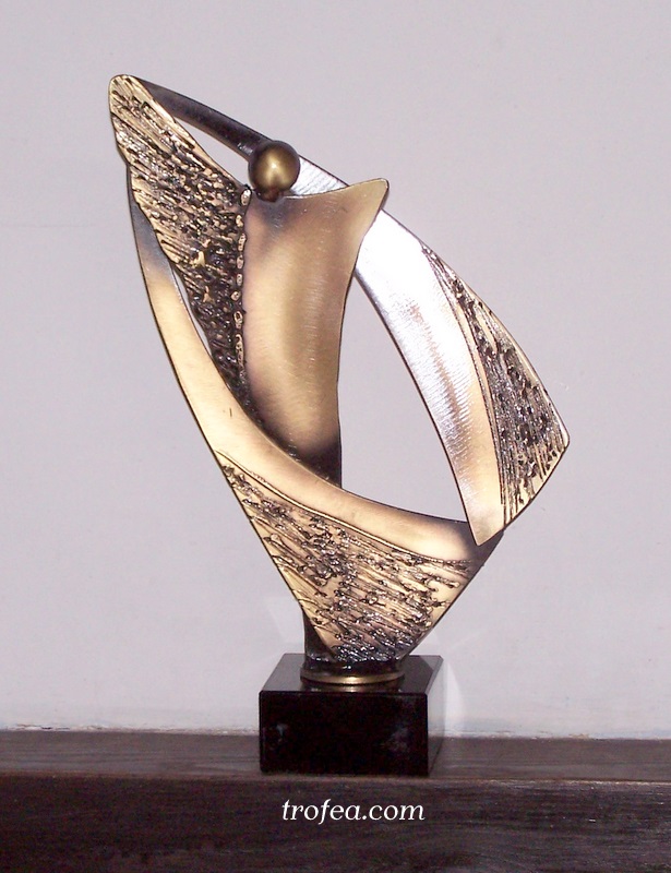 Statuetka Nagroda Rektora wykonana ze stali, galwanizowana na kolor złoty, na czarnym marmurowym postumencie z tabliczką.