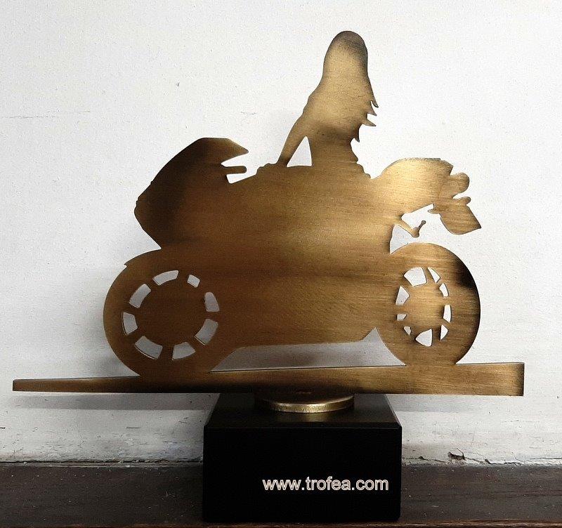 Statuetka sportowa Dama motocykl wykonana ze stali, galwanizowana na kolor złoty, z grawerowaną tabliczką.