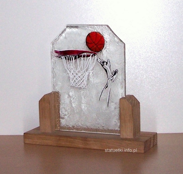 Statuetka - Piłka koszykowa. Statuetka wykonana metodą fusingu, zdobiona farbami wysokotemperaturowymi, umocowana na podstawie wykonanej z naturalnego dębu. Wysokość A -23 cm. B-21 cm. C-19cm