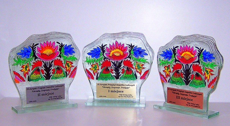 Statuetki wykonane z wielowarstwowego szkła stapiane w piecu. Statuetki zdobione ręcznie.