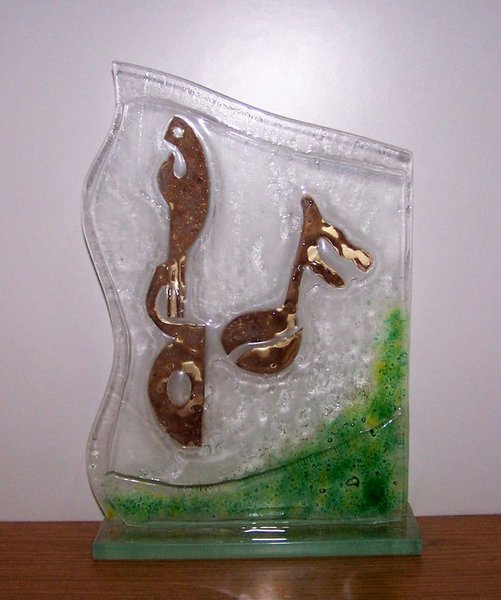Statuetka szklana. Elementy muzyczne statuetki wykonane są z metalu, i zatopione w szkle.