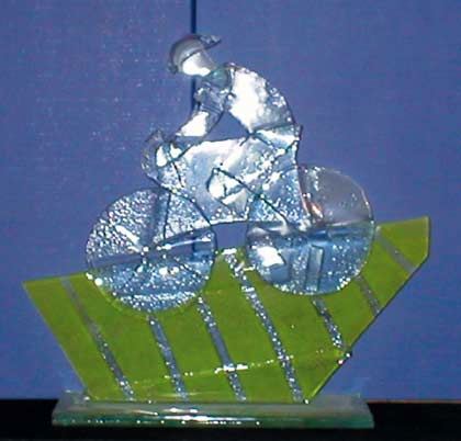 Kolarz - statuetka szklana. Statuetka wykonana metodą stapiania szkła- -fusingu. Statuetka umocowana na szklanej podstawce.