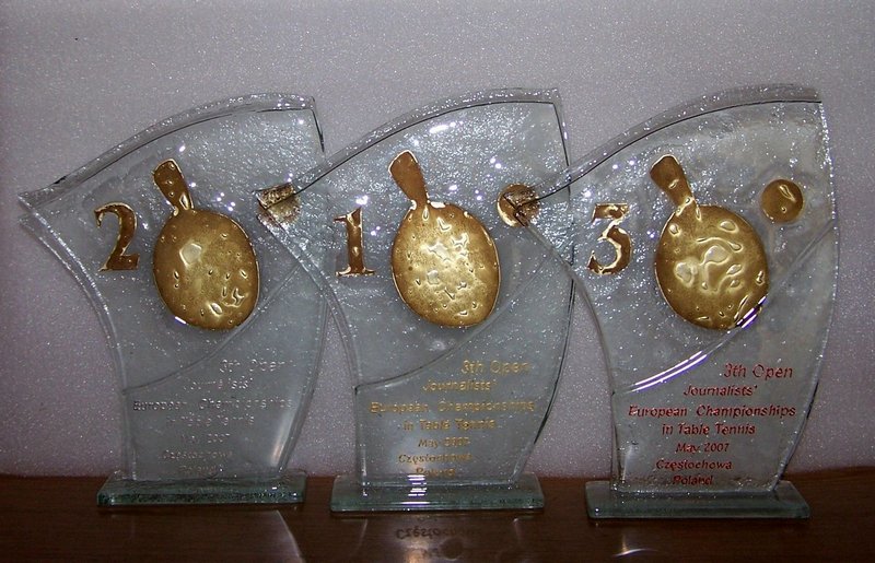 Statuetki szklane - Mistrzostwa w Tenisie Stołowym. Statuetki wykonane technologią fusingu. W statuetkach zatopione są elementy metalowe.